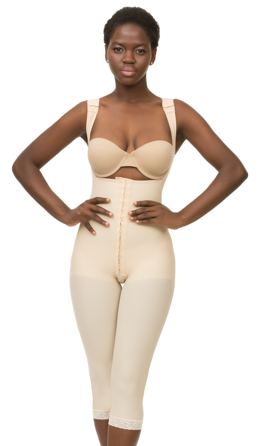 Faja completa de espalda, con compresión de piernas debajo de la rodilla alta con broches al frente (BE13-BK)