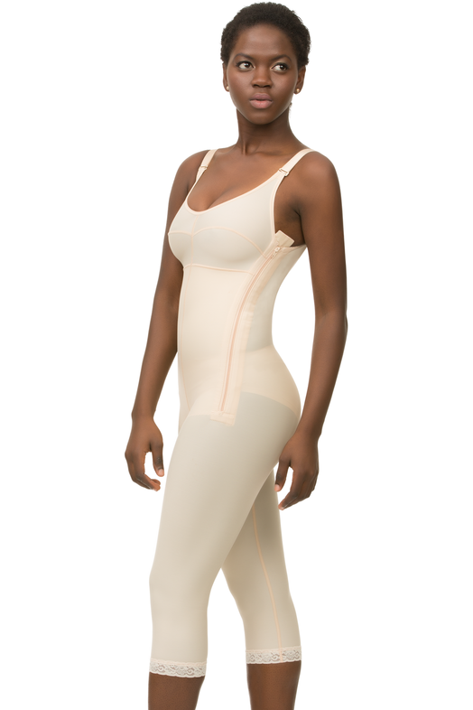 Este body suit cuenta con cremalleras suaves, tirantes ajustables, pierna de 3/4 de largo y un sostén quirúrgico suave.