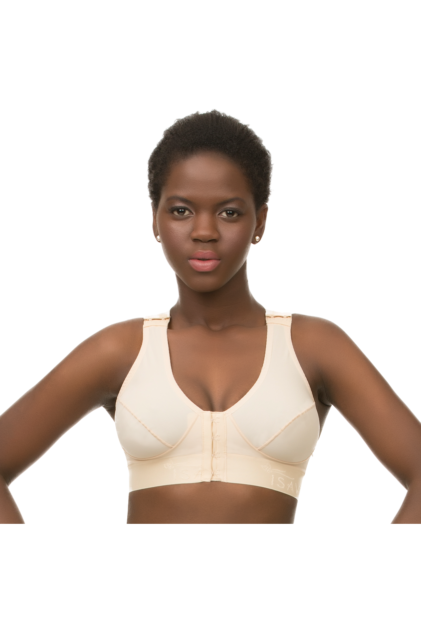 Brasier Sujetedor Deportivo con espalda cruzada para mujer de corte largo con cierre de ojal y gancho frontal, postquirúrgico de compresión (BR06)